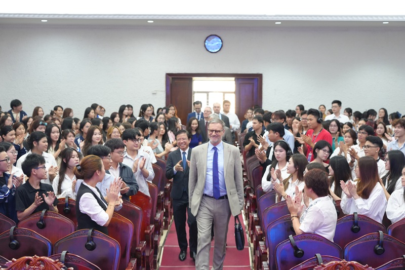 Đại sứ cũng đề cập một số định hướng hợp tác trong thời gian tới, trong đó hai nước sẽ tiếp tục tăng cường hợp tác trong các lĩnh vực như năng lượng hạt nhân, hàng hải, trí tuệ nhân tạo, an toàn thực phẩm bền vững. Cùng với đó, Pháp khuyến khích sinh viên Việt Nam đến học tập, nghiên cứu, qua đó góp phần thúc đẩy quan hệ hữu nghị và hợp tác giữa hai nước. Bên cạnh quan hệ song phương, hai bên cũng hướng tới việc tăng cường liên kết giữa Việt Nam với Liên minh châu Âu và khu vực ASEAN, mở rộng không gian hợp tác trong bối cảnh mới. Ngài Olivier Brochet, Đại sứ đặc mệnh toàn quyền Cộng hòa Pháp tại Việt Nam đã có bài thuyết trình trước giảng viên, cán bộ, sinh viên của Trường Đại học Khoa học Xã hội và Nhân văn. Ảnh: Thùy Dzung Cũng tại sự kiện, Đại sứ quán Pháp tại Việt Nam phối hợp Trường Đại học Khoa học xã hội và Nhân văn tổ chức lễ trao tặng Huân chương Cành cọ Hàn lâm (Ordre des Palmes académiques) cho hai nhà khoa học xuất sắc của nhà trường, gồm: Giáo sư, Tiến sĩ Hoàng Anh Tuấn, Hiệu trưởng nhà trường và Phó Giáo sư, Tiến sĩ Nguyễn Tuấn Cường, nghiên cứu viên cao cấp của Trường Đại học Khoa học xã hội và Nhân văn.