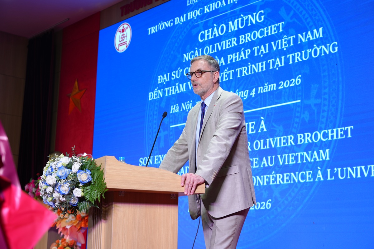 (Nhandan) Ngày 08/4/2026, Trường đại học Khoa học xã hội và Nhân văn, Đại học Quốc gia Hà Nội tổ chức các hoạt động trong chương trình “Thúc đẩy hợp tác khoa học và giáo dục giữa Trường Đại học Khoa học xã hội và Nhân văn với các đối tác Pháp trong bối cảnh mới”. Ngài Olivier Brochet, Đại sứ đặc mệnh toàn quyền Cộng hòa Pháp tại Việt Nam cùng đông đảo giảng viên, cán bộ, sinh viên, học viên của Trường đại học Khoa học xã hội và Nhân văn.